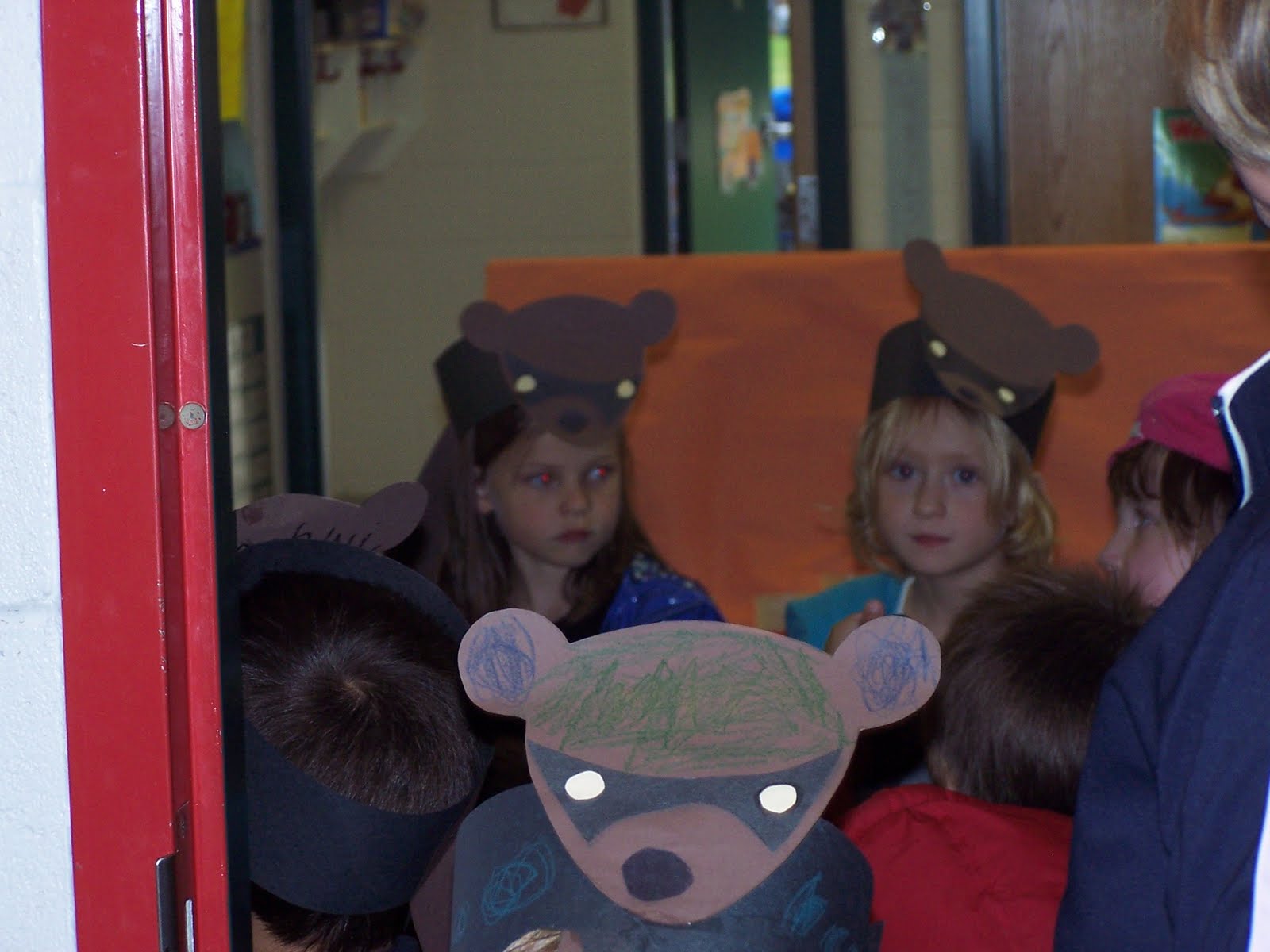 This is me waiting to be released at the end of the day. We made Racoon head-gear to go along with the book "The Kissing Hand" which we read.